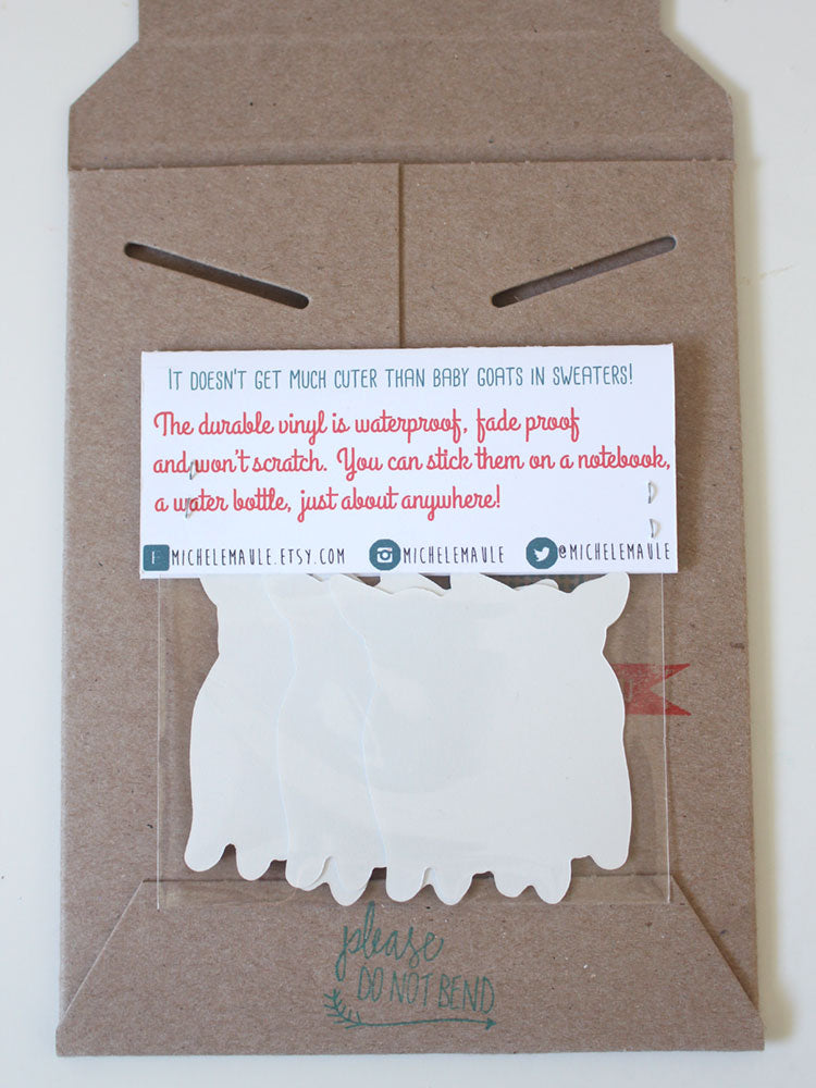 This is a listing for a set of three vinyl stickers featuring very cute goats wearing very cute sweaters.