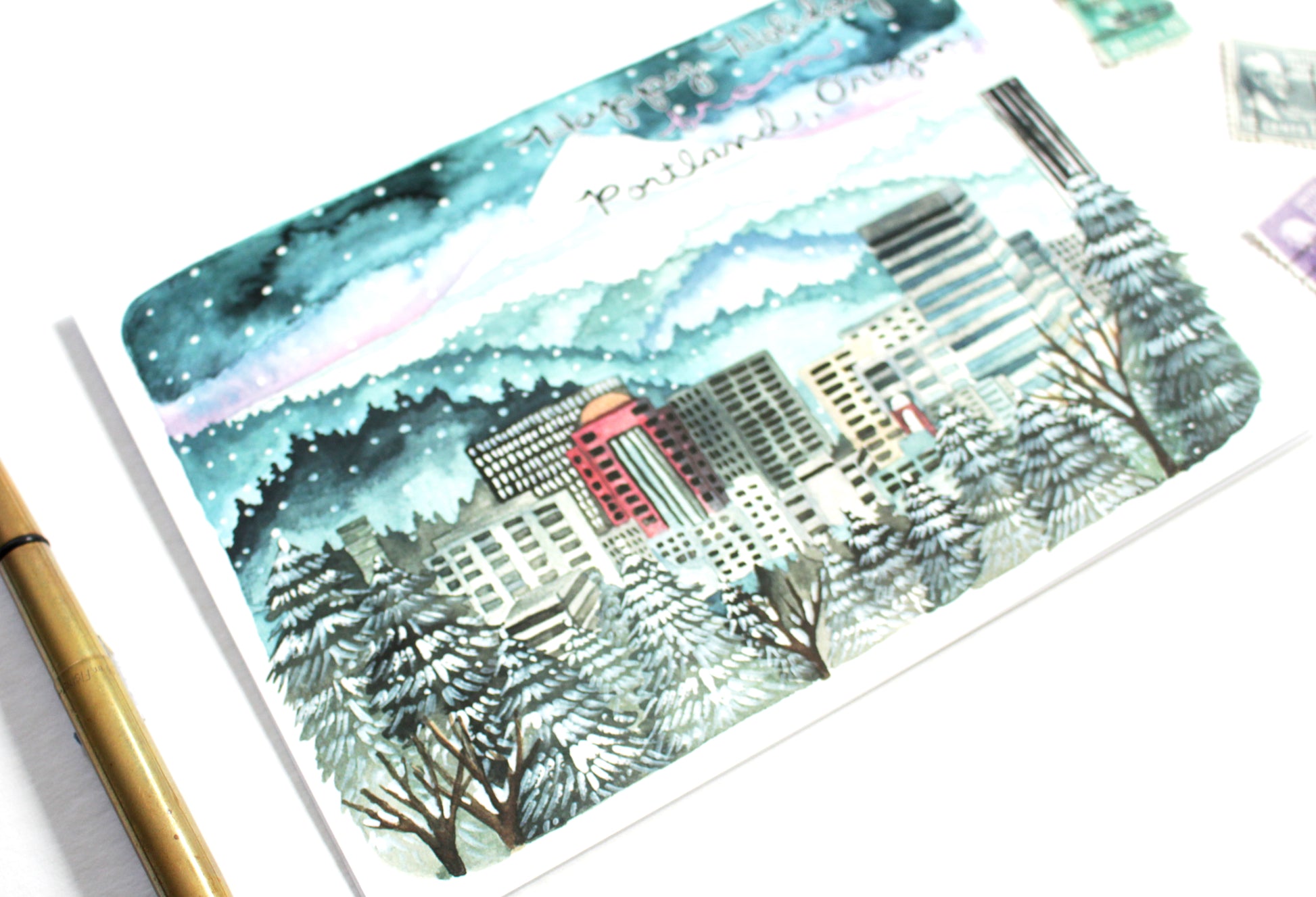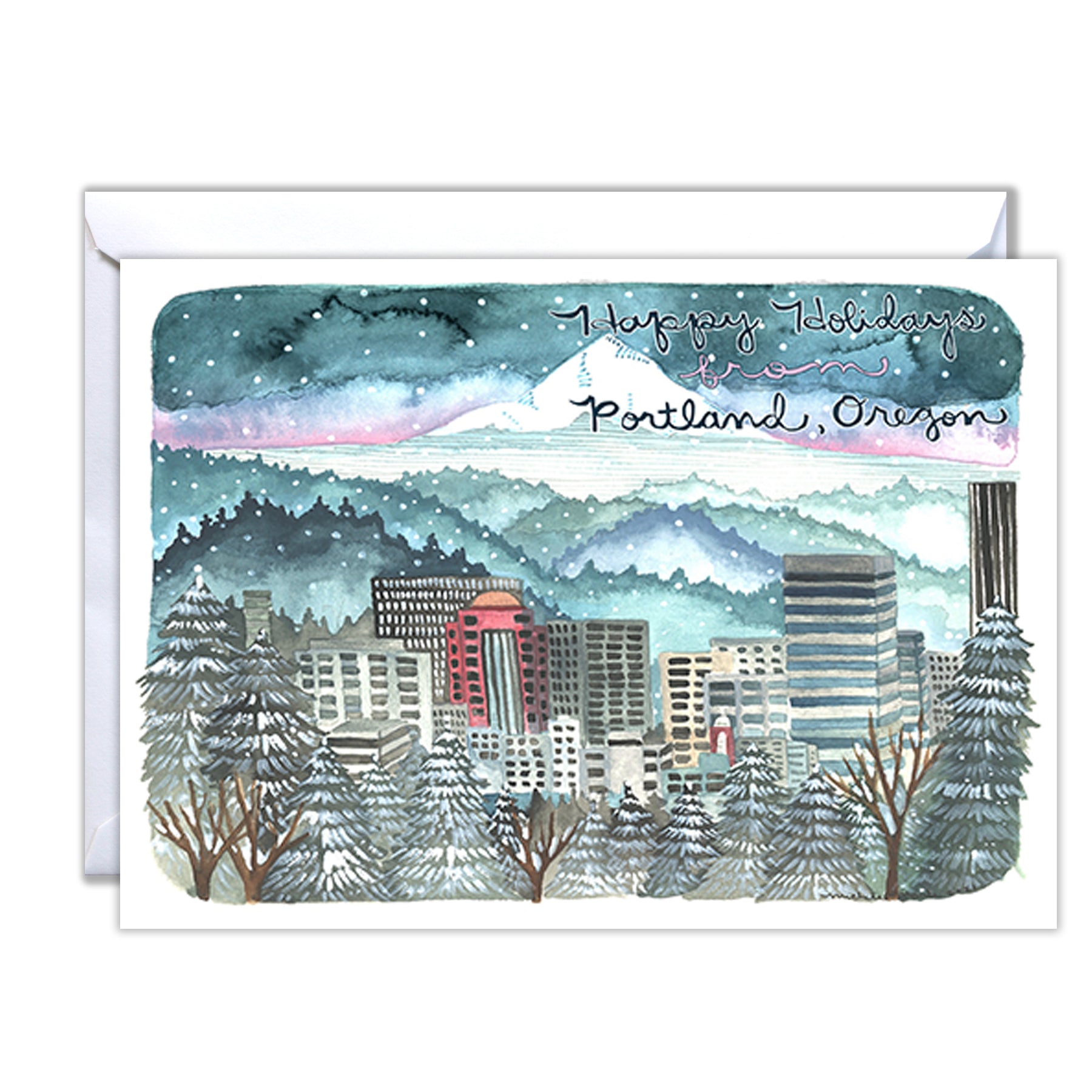 Hello! This is a listing for an illustrated holiday card featuring Portland's city skyline.