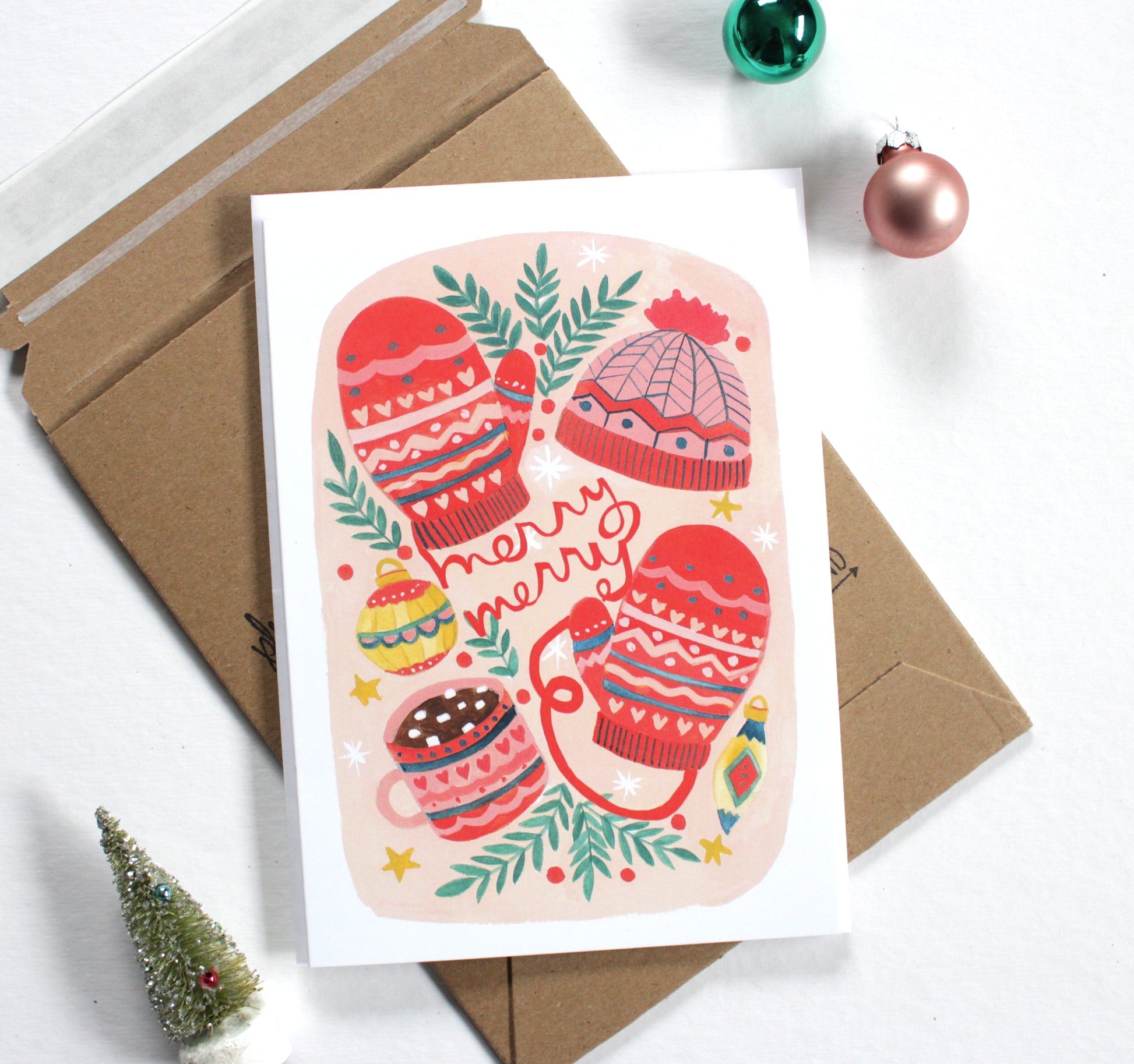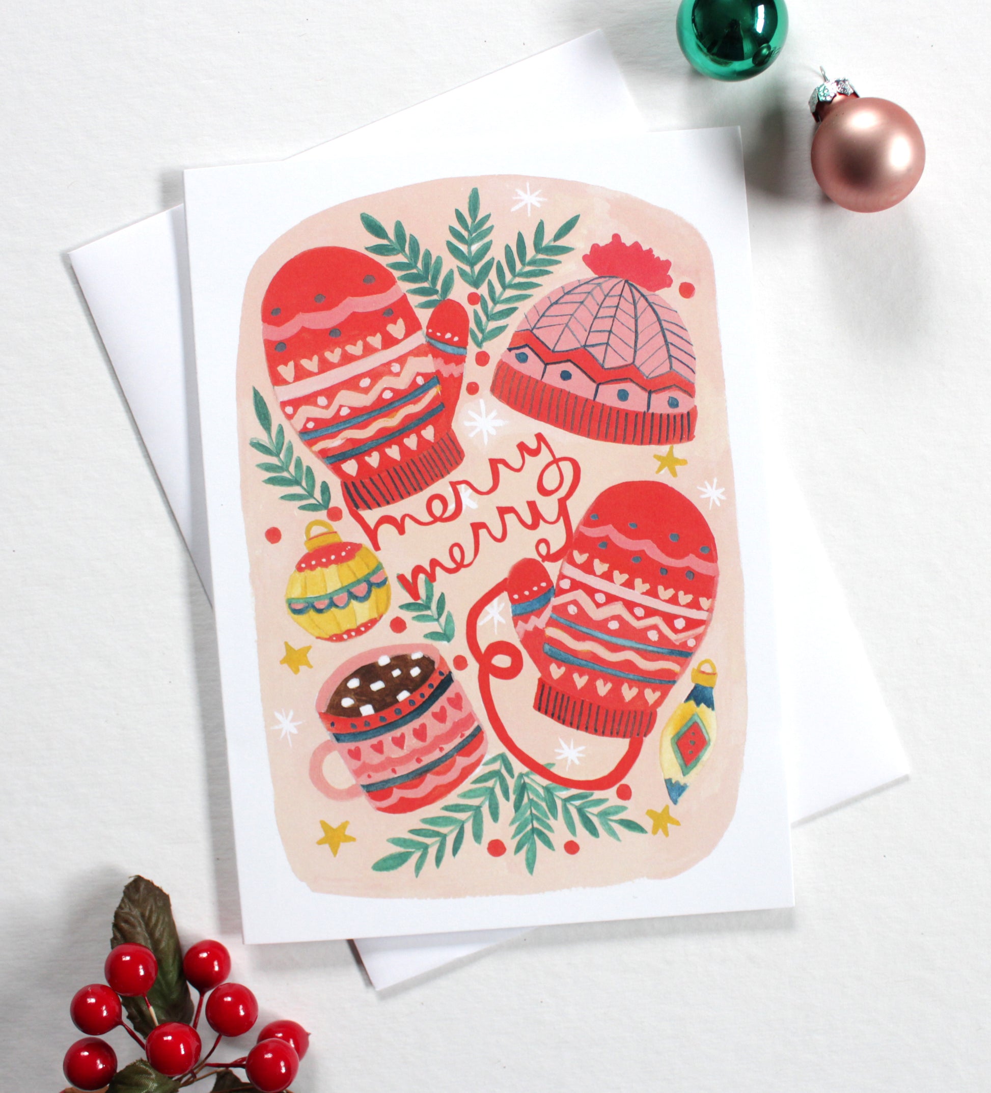 Hello! This is a blank holiday card with everything winter. Hot chocolate, mittens, ornaments and holly!