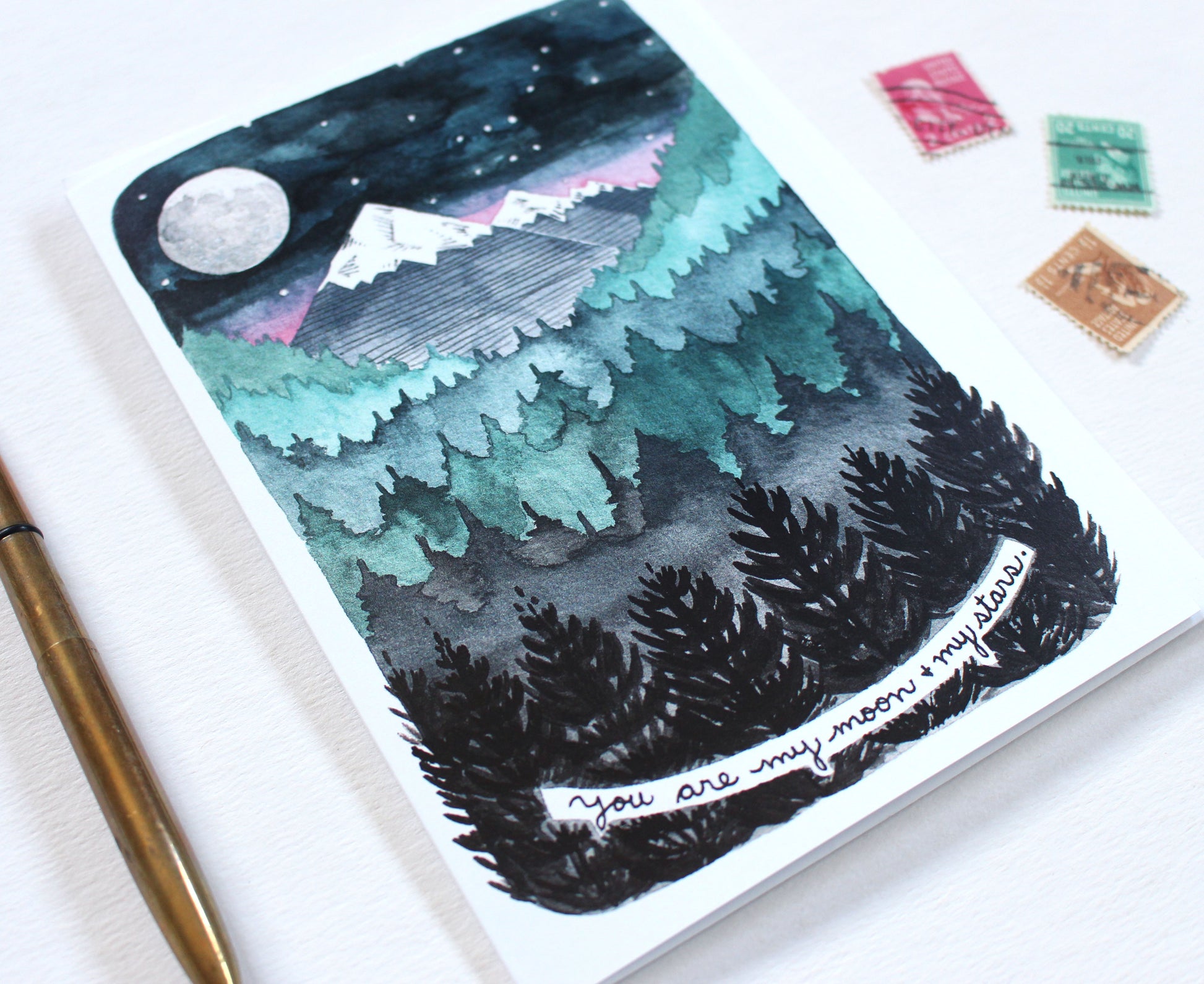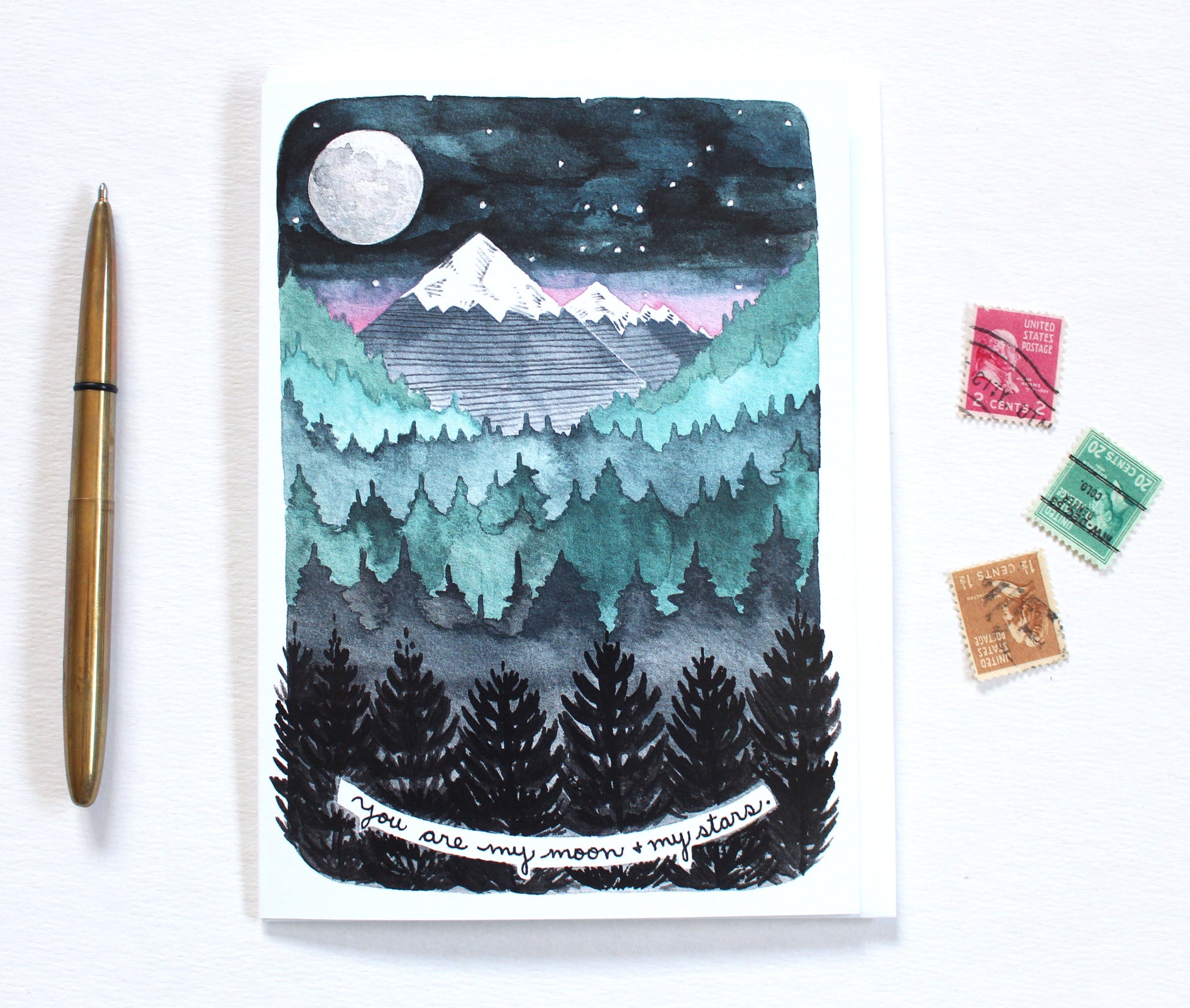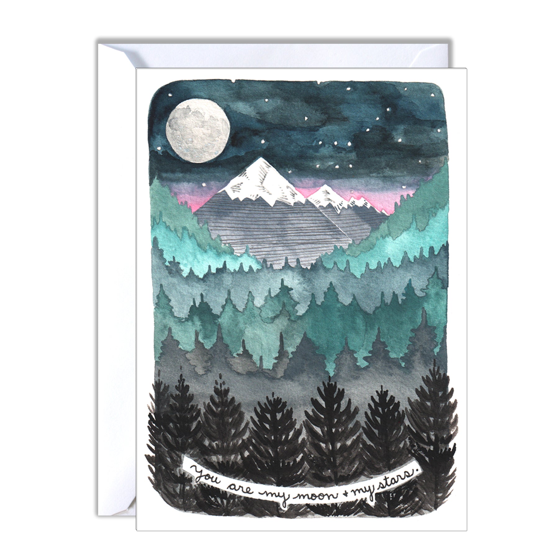 Hello! This is a blank greeting card featuring an illustration of a quiet mountain scene at night.