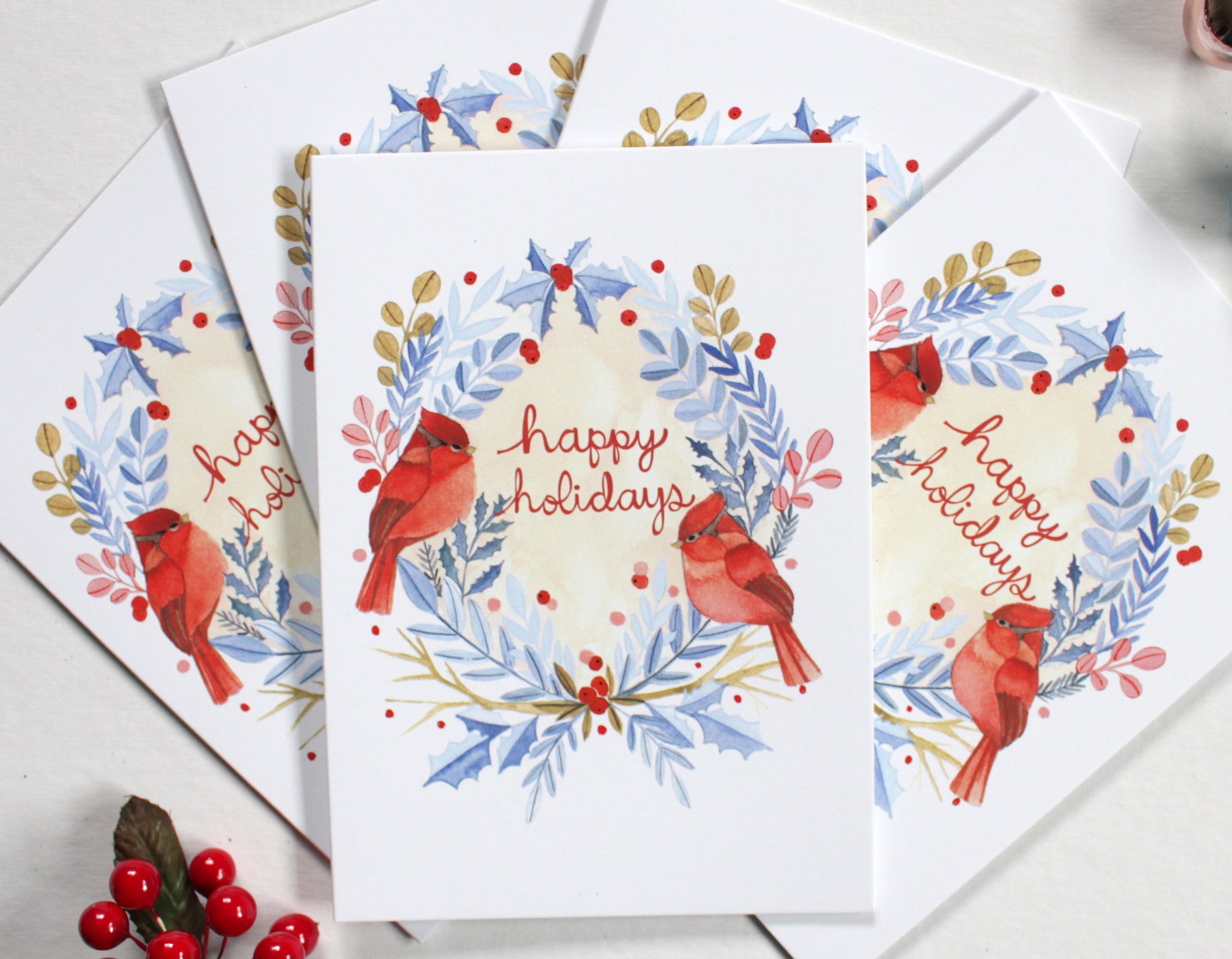 Hello! This listing is for a set of 5 holiday cards featuring two red cardinals sitting in a holiday wreath.
